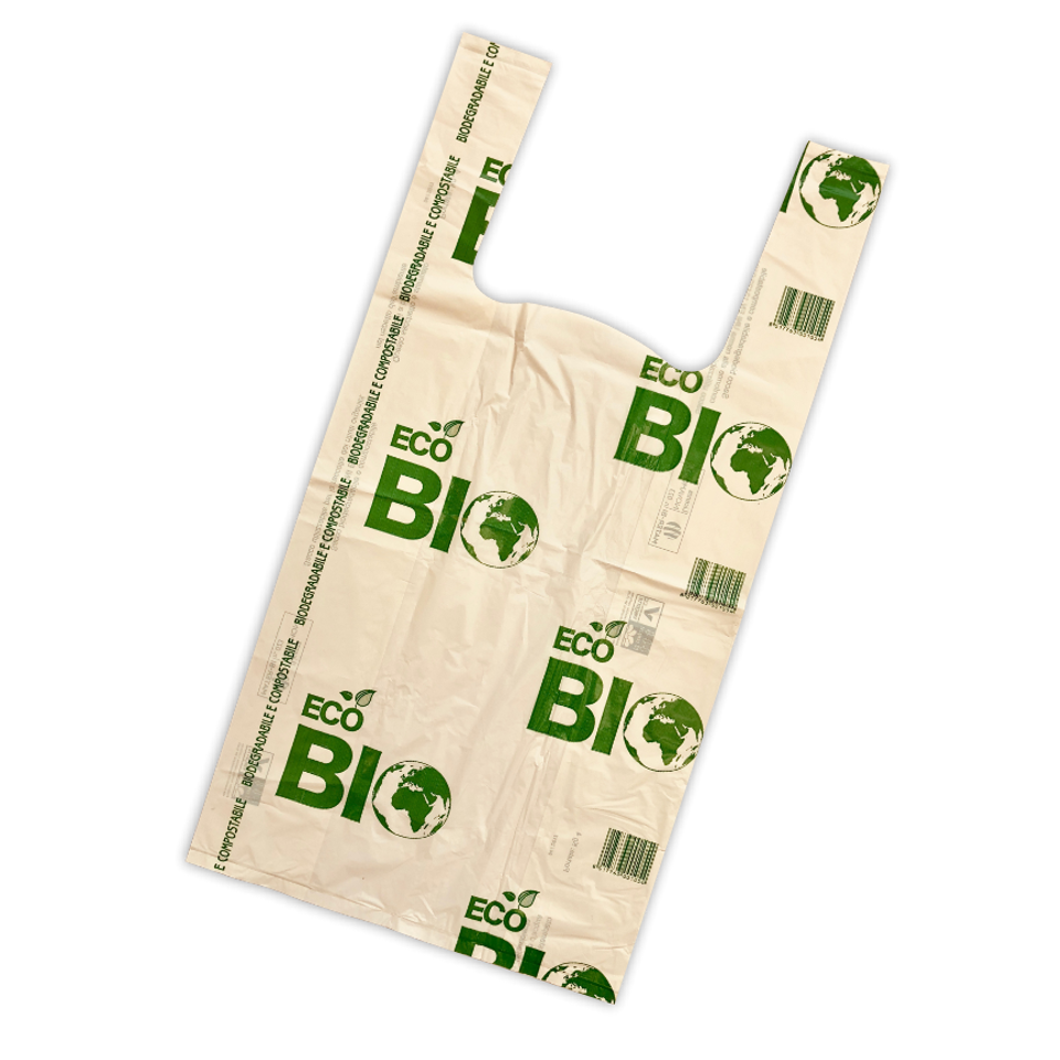 Bolsa blanca con asas fabricada con el azúcar sintetizado de la fécula de patata, material de origen 100% vegetal y, por lo tanto, no contaminante y totalmente compostable, con propiedas olfativas neutras. Impreso en una cara con tinta de base al agua. Al ser un material de origen vegetal es aconsejable no almacenarlo más de 2 años. Norma EN 13432