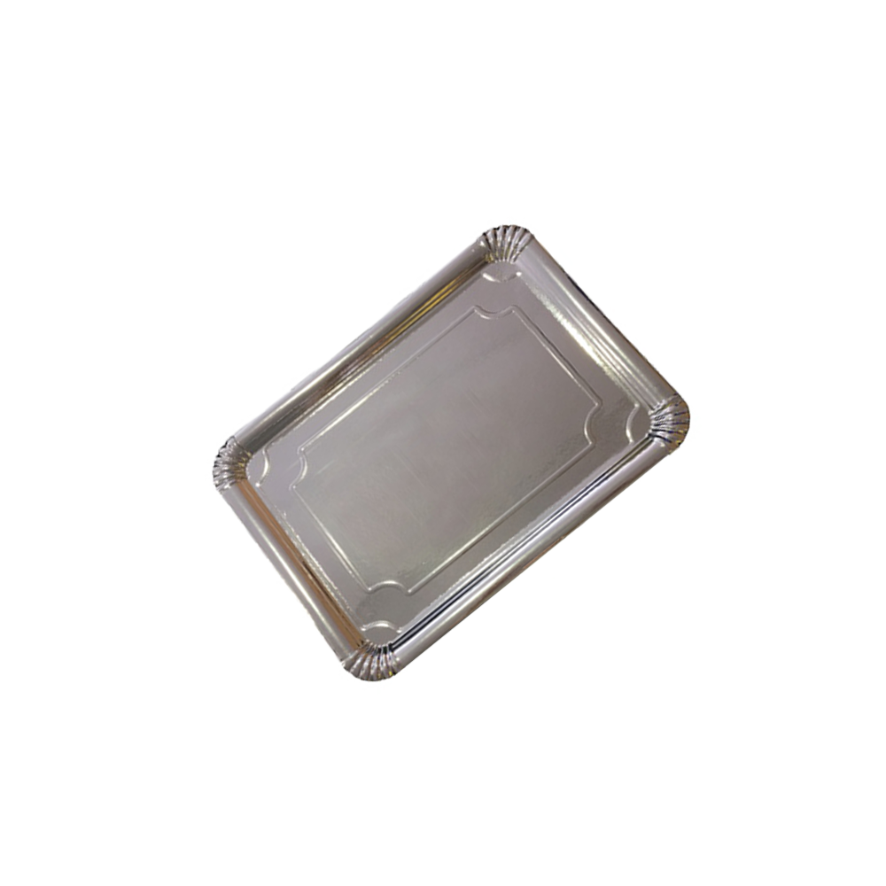 ELEGANTE, SENCILLA Y RESISTENTE. ESTA BANDEJA DE CARTON PLATEADA LA PODRÁ UTILIZAR DE MANERA CÓMODA Y ATRACTIVA, PARA LLEVAR PASTELERÍA O COMO EXPOSITOR DE SUS PRODUCTOS EN MOSTRADOR.